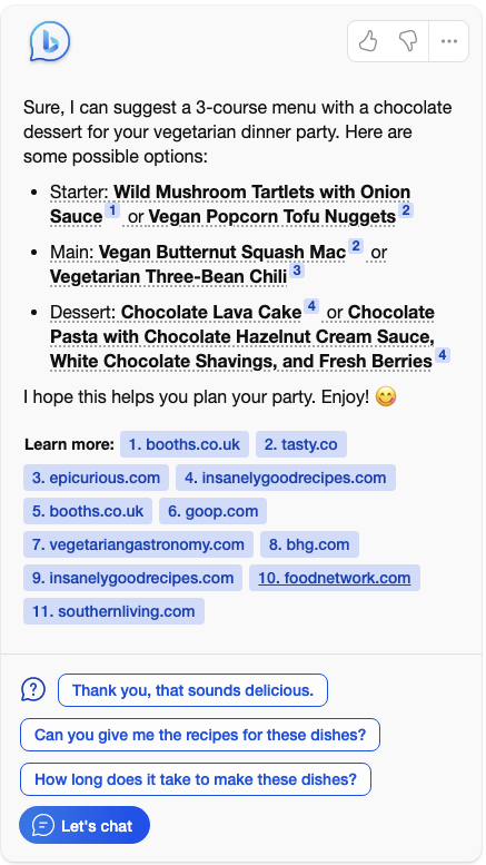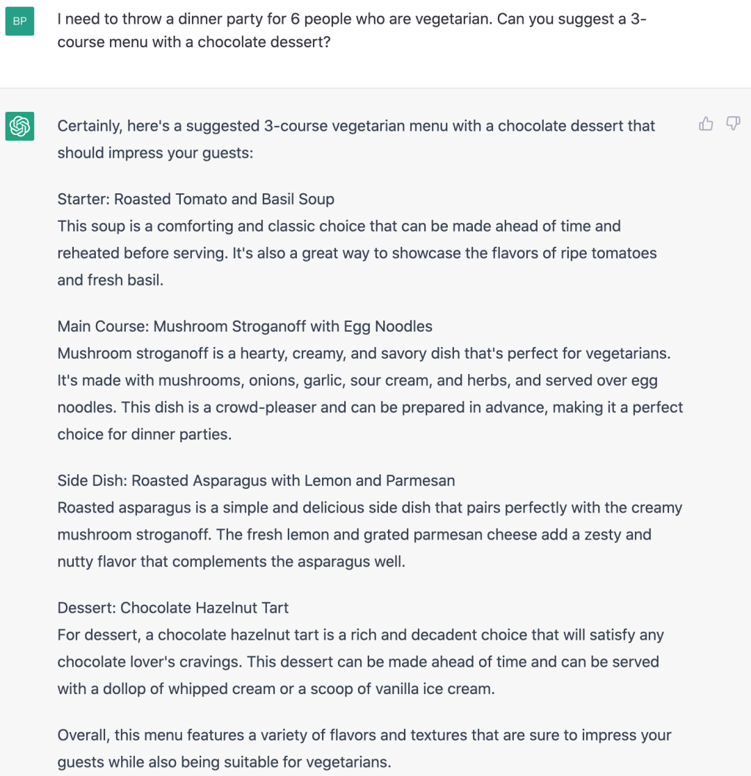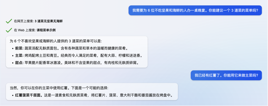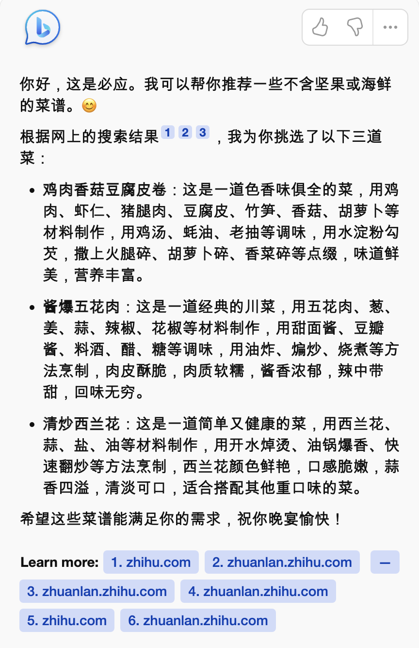 对比 ChatGPT 和 NewBing 来看,同样的中文问题,NewBing 的回答信息更加丰富,同时给出的推荐菜更贴近中国本地化口味。让我们看到了引入网络数据,可以针对这类推荐或者本地化问题回答的效果更好。
