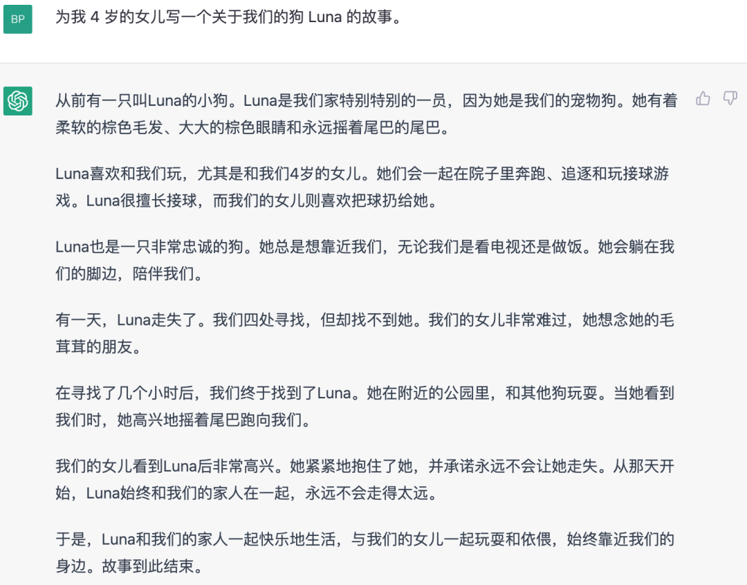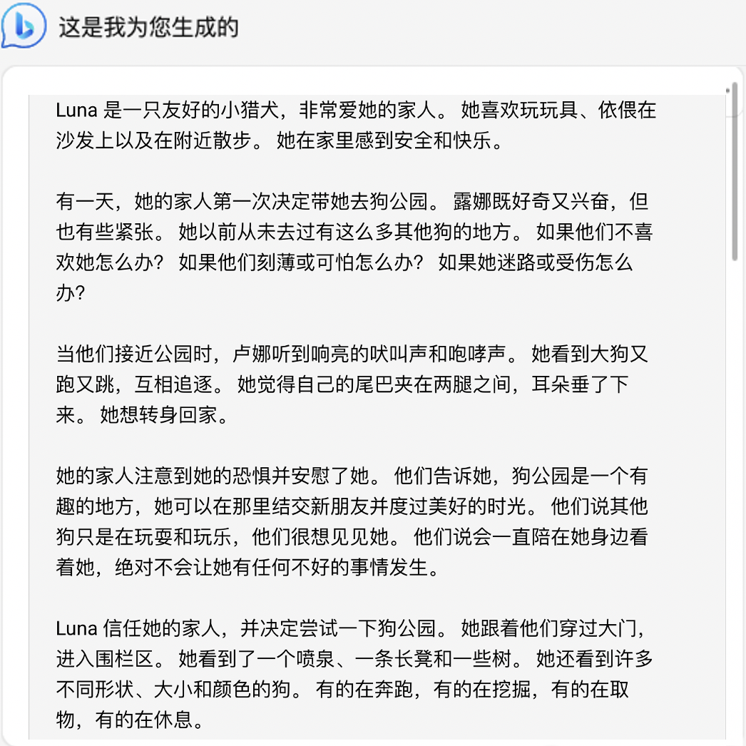 通过写故事案例 “为我 4 岁的女儿写一个关于我们的狗 Luna 的故事。” ,对比 ChatGPT 和 NewBing 的写作能力。上图为 ChatGPT 的写作答案,质量个人感觉更好,下图为 NewBing 的写作结果,感觉更多虚构和拼凑感。