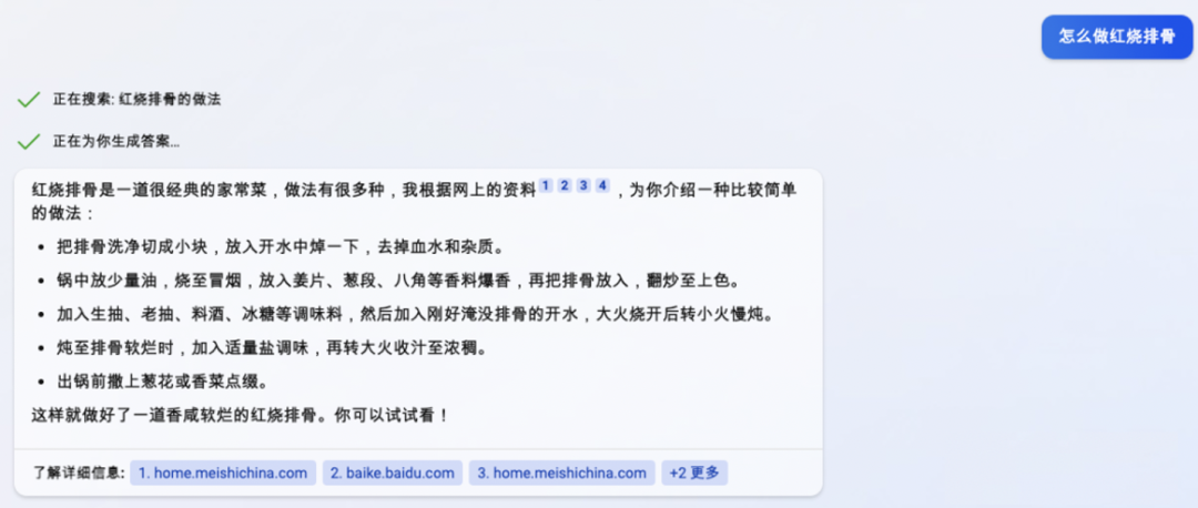 我们可以看到搜索“怎么做红烧排骨”,NewBing 理解你的问题搜索“红烧排骨的做法”,根据网上的资料,结合模型生成能力,而且给出了参考链接,总结输出的答案让人感觉非常靠谱、可信。