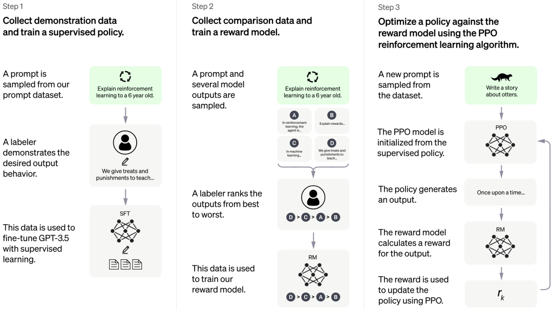 第三步:强化学习来增强微调模型。使用第一步微调 GPT3.5 模型初始化 PPO 模型,采样一批和前面用户提交 prompt 不同的集合,使用 PPO 模型生成答案,使用第二步回报模型对答案打分。通过产生的策略梯度去更新 PPO 模型。这一步利用强化学习来鼓励 PPO 模型生成更符合 RM 模型判别高质量的答案。