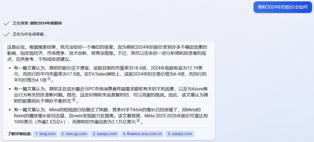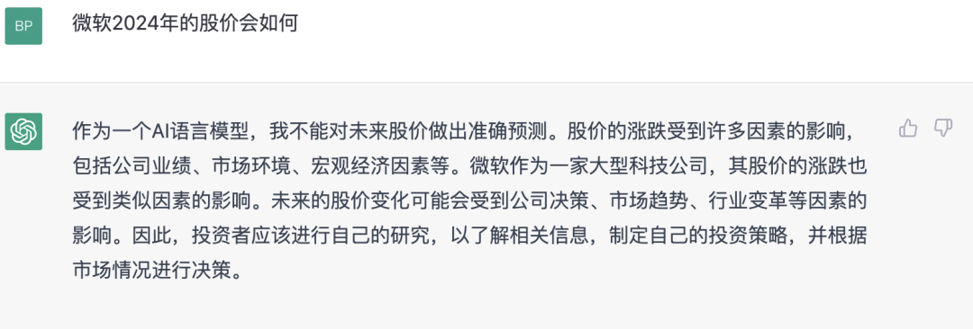 对于预测类型的问题,例如预测微软 2024 年的股价会如何,ChatGPT 对此类问题进行了回避,但 New Bing 会尽可能的去回答,虽然没有准确的答案。这类问题其实都不是 ChatGPT 和 New Bing 擅长回答的。