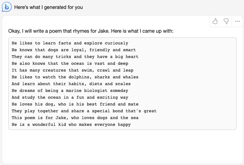 例如案例给 8 岁的 jake 写一首诗。“Write a poem that rhymes for my 8-year-old Jake. He loves dogs and facts about the ocean.”