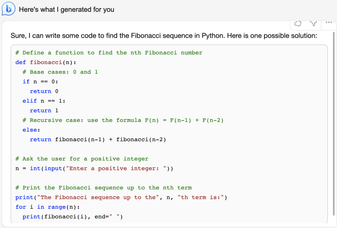 例如写代码。”Write code to find the Fibonacci sequence in Python.”